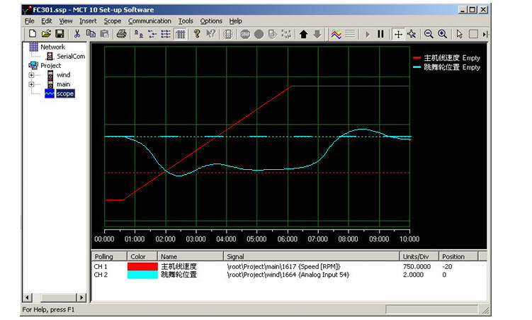 卷繞控制的特點:同樣的一套PID調節參數,勻速時易于穩定,波動也較??;而加速時就不易于穩定,而且因為跳舞輪位置有靜差,波動幅度也較大。因此PID調節參數主要針對加減速過程予以優化。MCT軟件有數字示波器功能,通過實時觀測線速度和跳舞輪位置在加減速時的變化曲線,能很方便地調整調節參數。